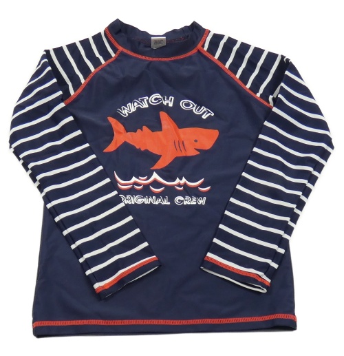 Tmavomodro-bílé UV triko se žralokem a nápisy Topolino