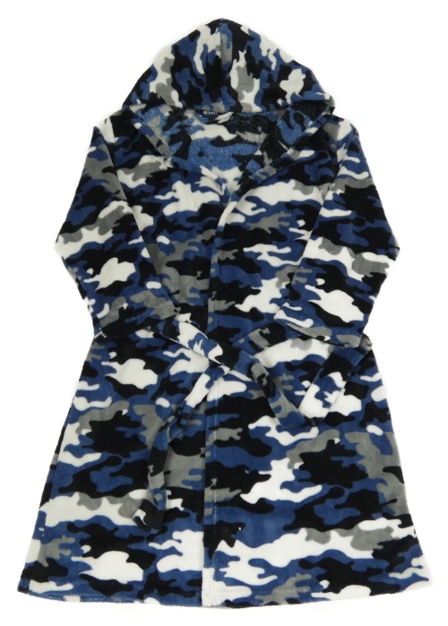 Tmavomodro-černo-šedý army chlupatý župan s kapucí