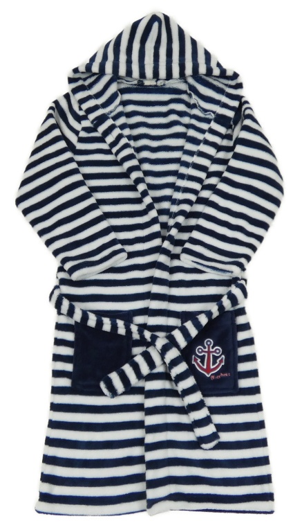 Tmavomodro-bílý pruhovaný chlupatý župan s kapucí