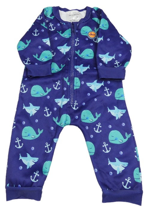 Tmavomodrý silnější neoprenový overal s velrybami Swimbubs