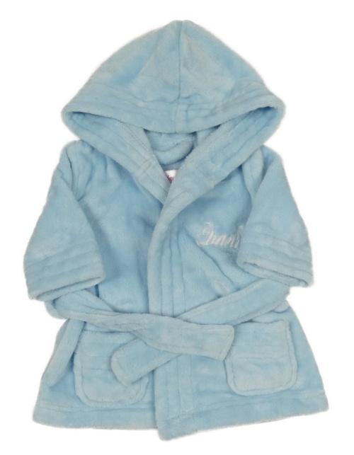 Světlemodrý chlupatý župan s kapucí a nápisem