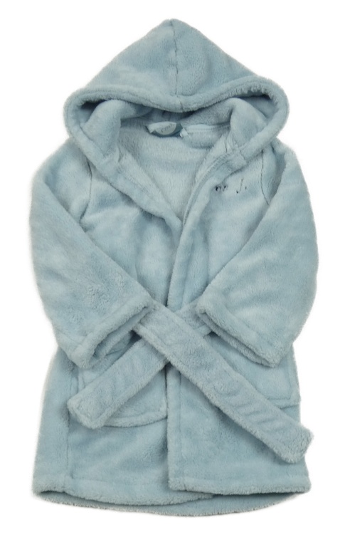 Světlemodrý chlupatý župan s nápisem a kapucí