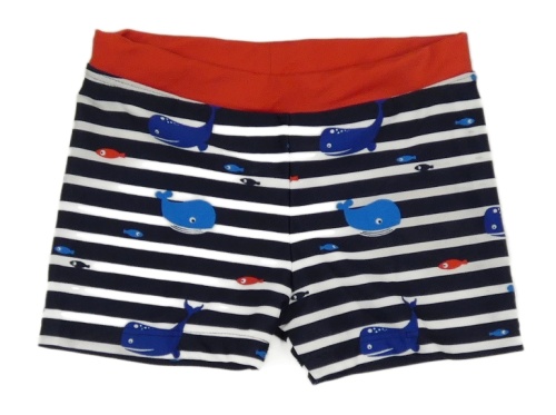 Tmavomodro-bílo-černé pruhované nohavičkové plavky s velrybami Topomini