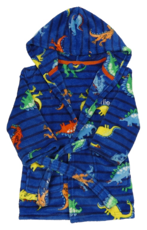 Modrý pruhovaný chlupatý župan s dinosaury a kapucí