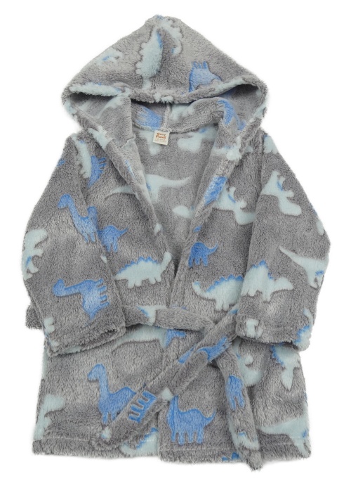Šedý melírovaný chlupatý župan s dinosaury a kapucí