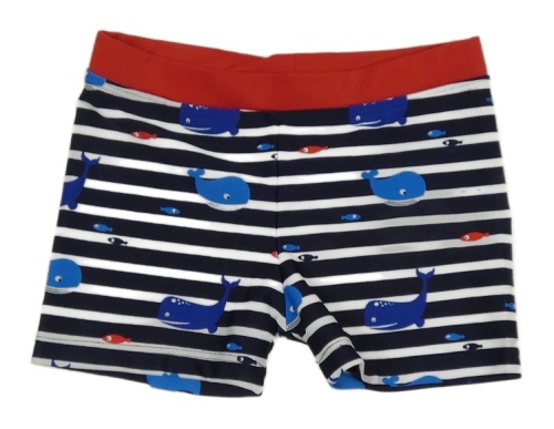 Tmavomodro-bílé pruhované nohavičkové plavky s velrybami Topomini