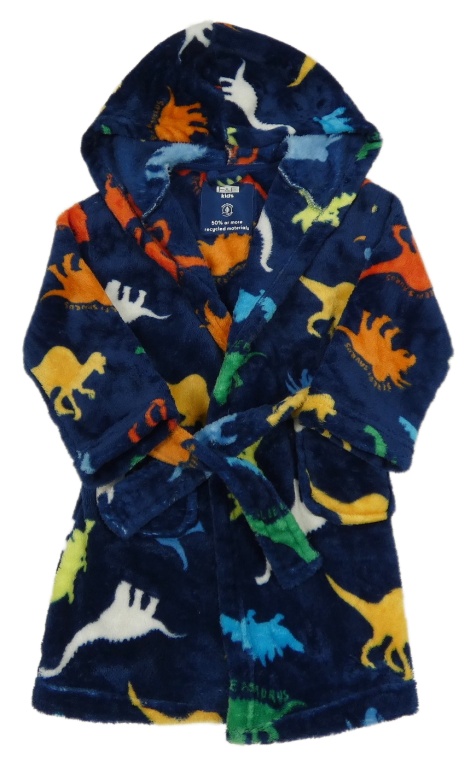 Tmavomodrý plyšový župan s barevnými dinosaury a kapucí F&F