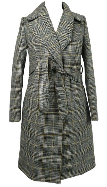 Dámský černo-žlutý kostkovaný vlněný kabát s páskem Orsay