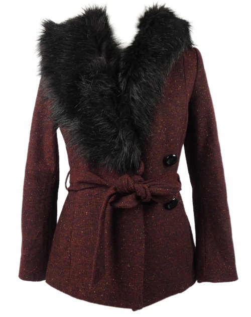 Dámský vínový melírovaný vlněný krátký kabát s kožíškem s páskem H&M