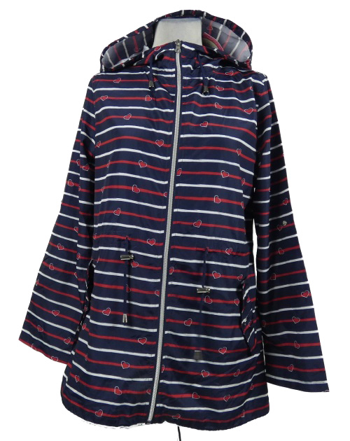 Dámská tmavomodro-červeno-bílá pruhovaná šusťáková parka s kapucí
