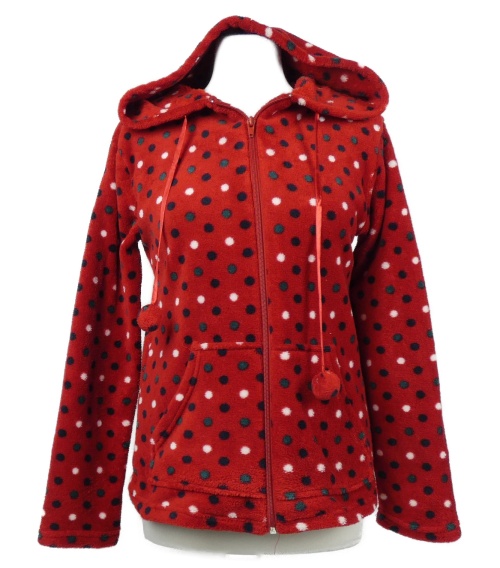 Dámská červená chlupatá puntíkovaná propínací mikina s kapucí