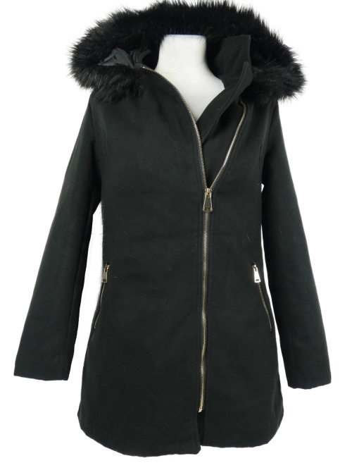 Dámský černý flaušový zateplený kabát s kapucí
