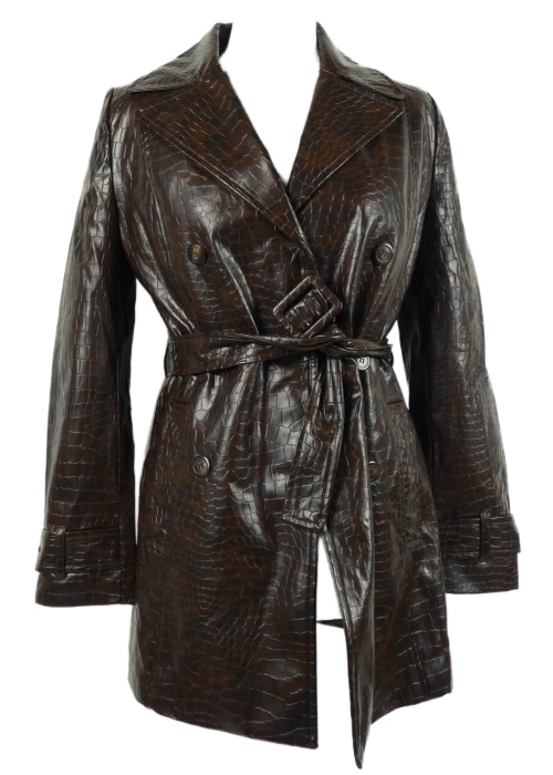 Dámský hnědý vzorovaný koženkový kabát s páskem MNG