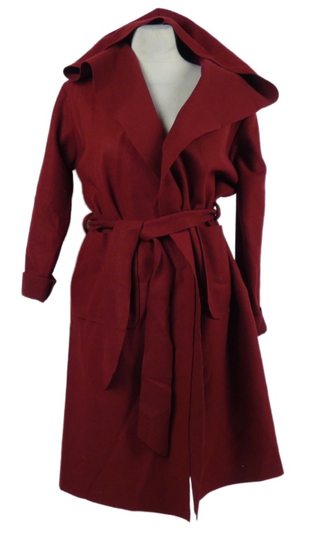 Dámský karmínový flaušový kabát s kapucí a páskem