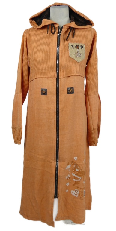 Dámský oranžový proužkovaný plátěný kabát s motýlkem a kapucí