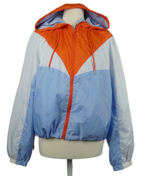 Dámská světlemodro-červeno-bílá šusťáková podzimní bunda s kapucí
