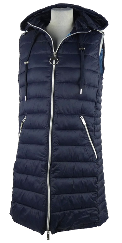 Dámská tmavomodrá šusťáková prošívaná zateplená péřová vesta s kapucí Suza