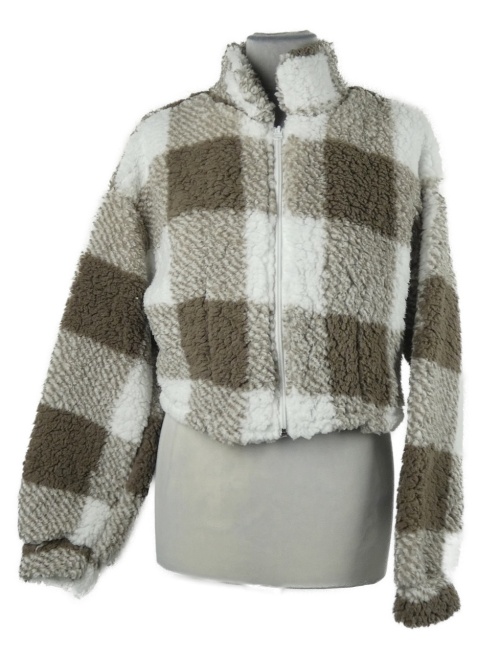 Dámská hnědo-bílá kostkovaná huňatá crop bunda