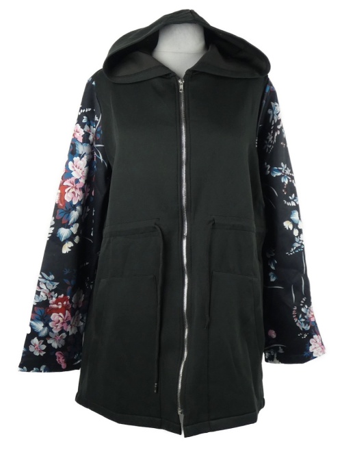Dámský černý teplákový kabát s květovanými rukávy a kapucí
