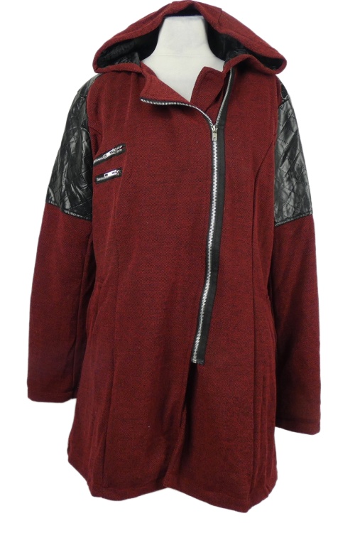 Dámský červeno-černý melírovnaý pletený lehce zateplený kabát s kapucí