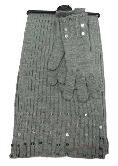 Nové - 2set - Šedá žebrovaná pletená šála + rukavice s flitry TU
