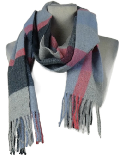 Dámská šedo-modro-růžová kostkovaná šála s třásněmi