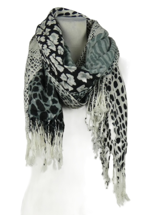 Dámská šedo-černo-bílá vzorovaná šála s třásněmi