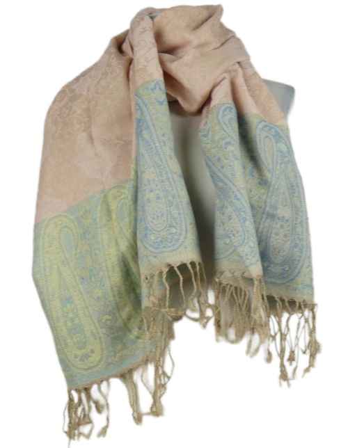 Dámská růžovo-modro-zelená vzorovaná pašmína s třásněmi