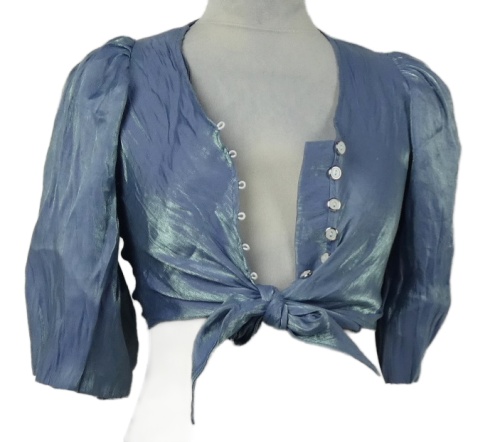 Dámská modrá třpytivá crop halenka s uzlem