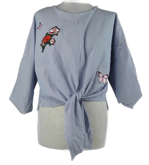 Dámská modro-bílá proužkovaná crop halenka s nášivkami a uzlem