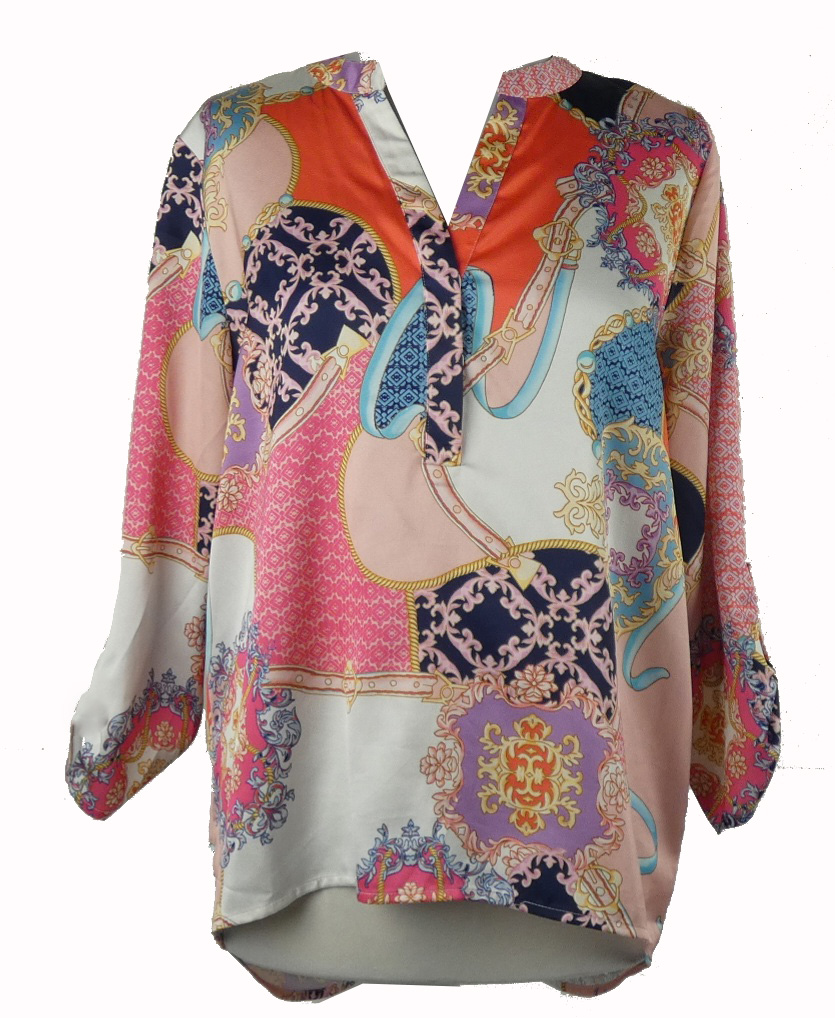Dámksá růžovo-barevná vzorovaná saténová halenka s rolovacími rukávy