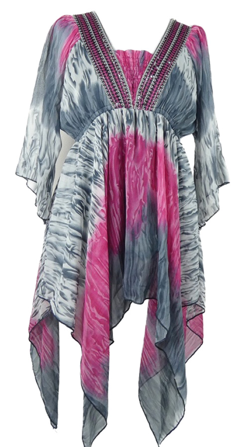 Dámská šedo-růžová šifonová asymetrická tunika s výšivkou