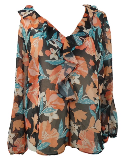 Dámská černo-korálovo-modrá květovaná šifonová halenka s volánky