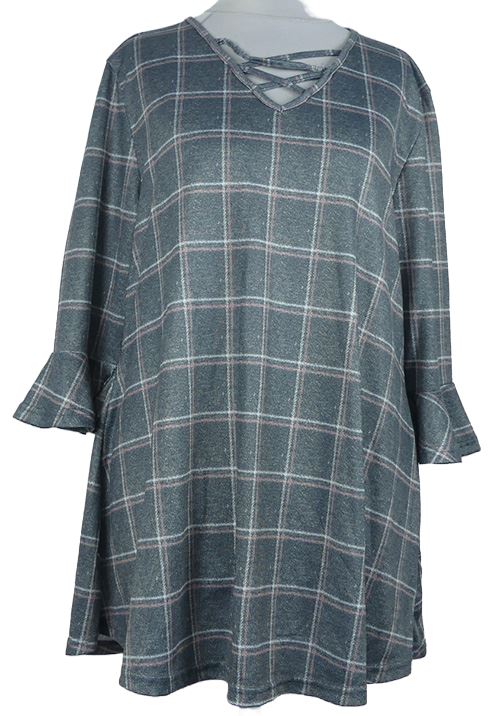 Dámská šedo-růžová kostkovaná halenková tunika se zkříženým výstřihem