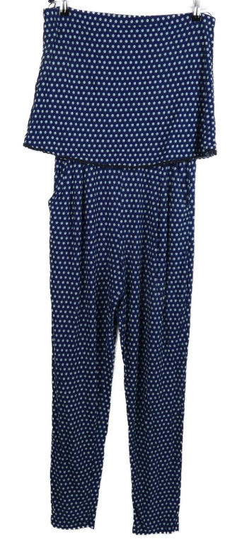 Dámský tmavomodrý vzorovaný kalhotový overal bez ramínek s volánem Next