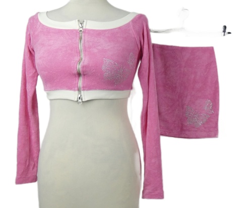 2set- Dámská růžovo-bílá froté propínací crop mikina s motýlky + sukně
