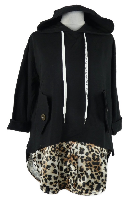 Dámská černo-vzorovaná mikinová tunika s kapucí