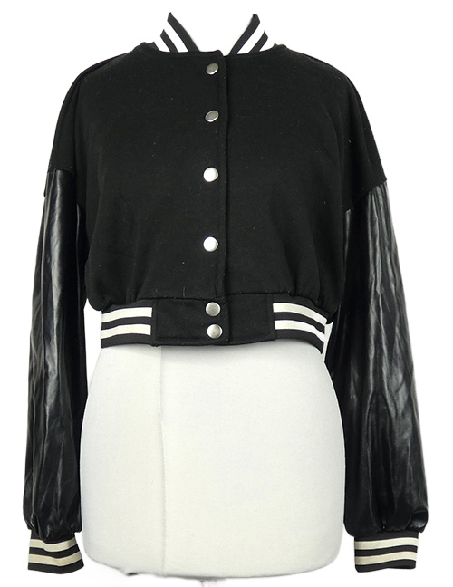 Dámská černá baseballová crop mikina s koženkovými rukávy