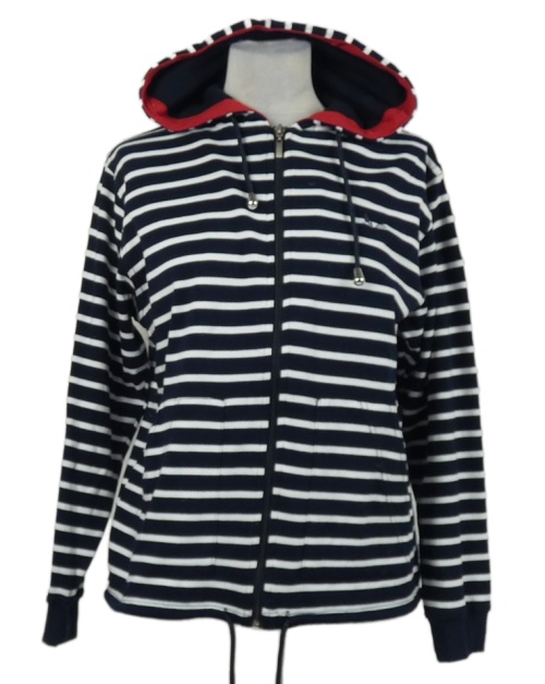 Dámská tmavomodro-bílá pruhovaná propínací mikina s kapucí