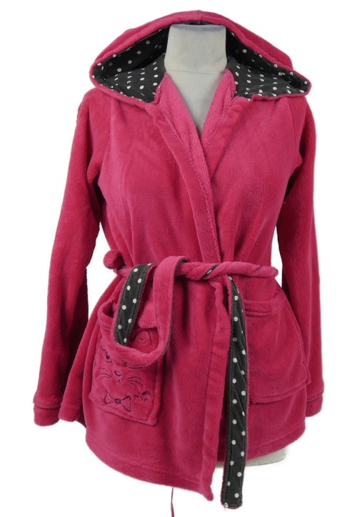 Dámský tmavorůžový plyšový župan s kočičkou a páskem