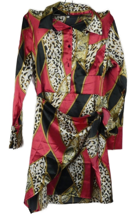 • Dámské červeno-béožovo-černé vzorované saténové košilové šaty s páskem Shein vel. 32