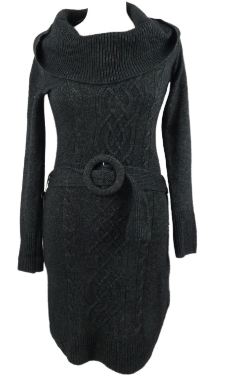 Dámské tmavošedé vzorované svetrové šaty s komínovým límcem a páskem