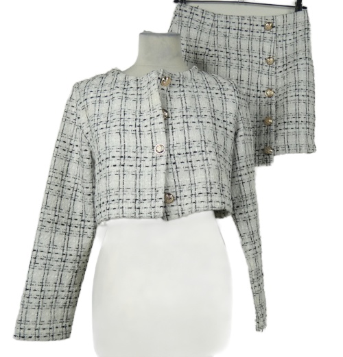 2set - Dámský černo-bílý kostkovaný pletený crop kabátek + sukně Shein