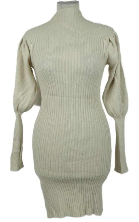 Dámské béžové žebrované svetrové šaty s nabíranými rukávy