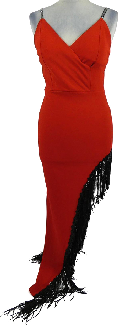 Dámské červené společenské asymetrické šaty s černými třásněmi s flitry