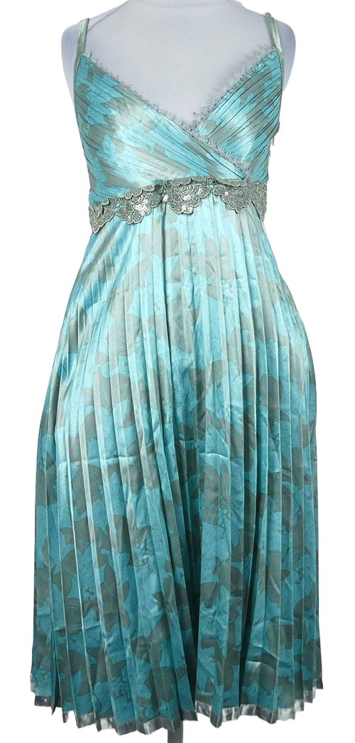Dámské světlemodro-šedé květované saténové plisované koktejlové šaty s krajkou