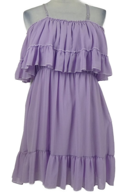 Dámské lila šifonové šaty s odhalenými rameny a volánky