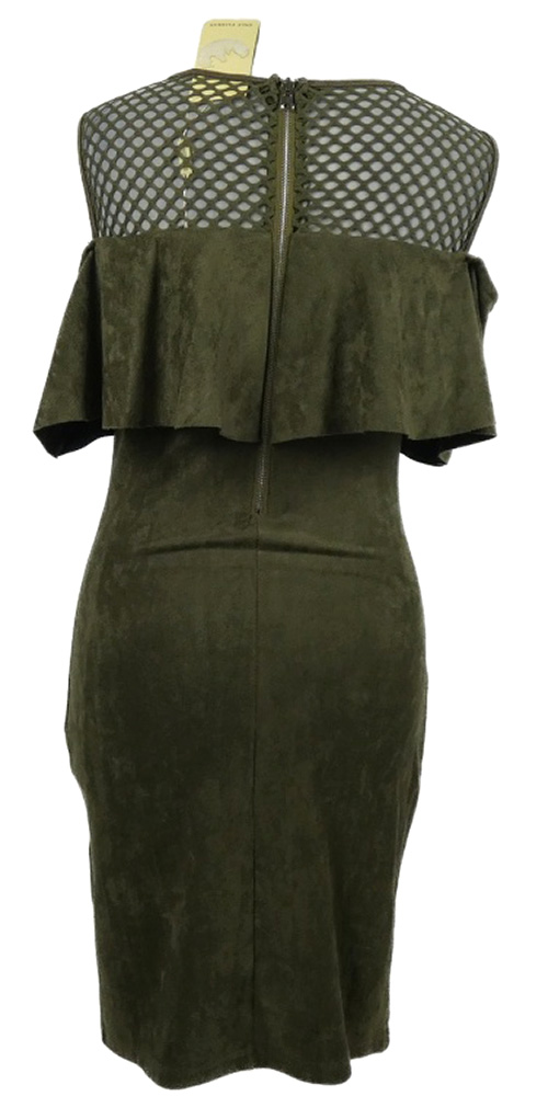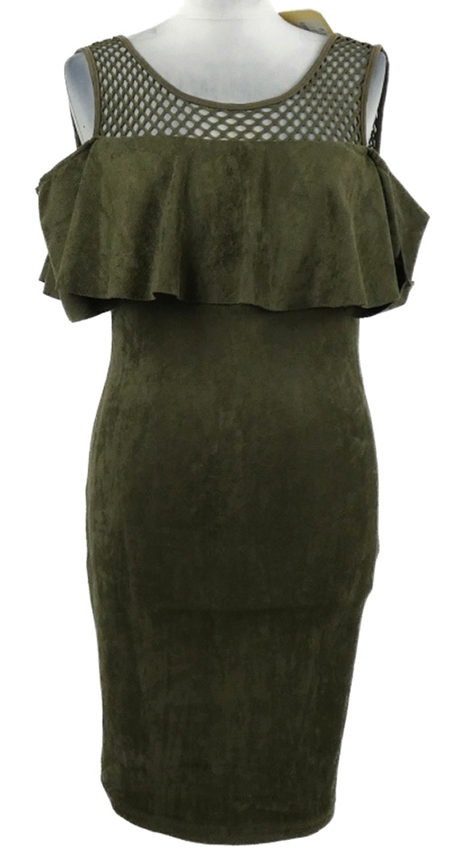 Nové - Dámské khaki semišové pouzdrové šaty se síťovanými ramínky a volánkem