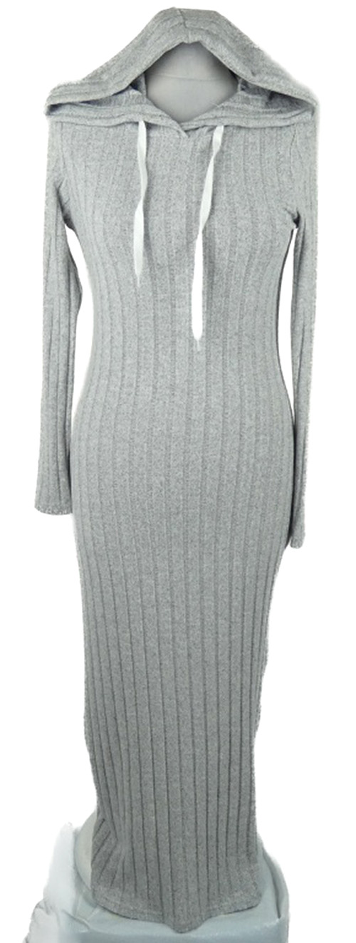 Dámské šedé žebrované pletené dlouhé šaty s kapucí