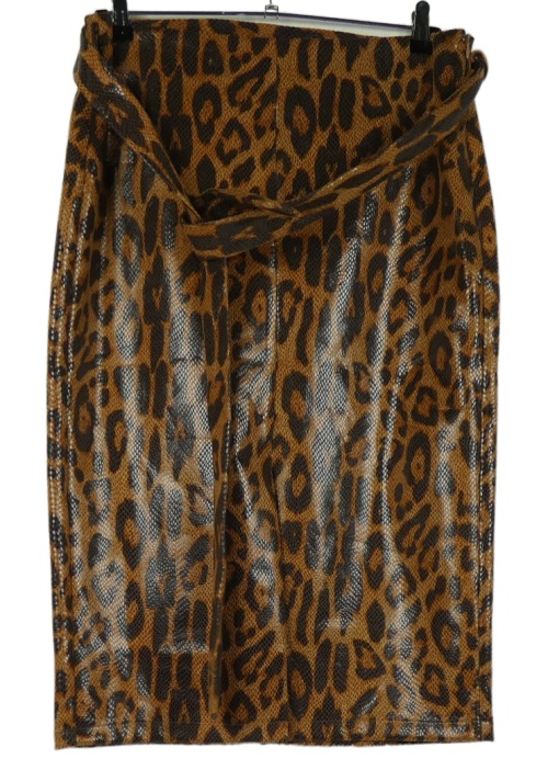 Dámská skořicovo-černá vzorovaná lesklá pouzdrová midi sukně s páskem Savida